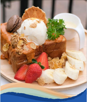 pastries, savory toasts, unique desserts, teas, coffees and refreshing
